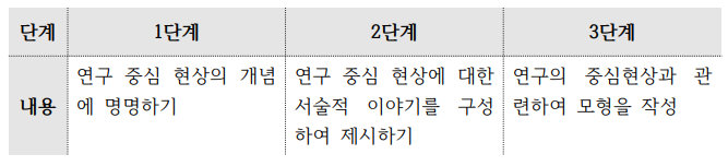 자료에 대한 개념의 명명하기, 축소, 속성과 차원에 따른 범주의 정교화, 핵심 범주를 통한 코딩과정으로 분석한다.